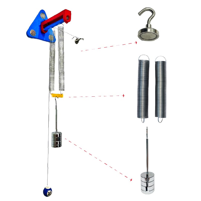 - Các thành phần thiết yếu: Bao gồm chân giá treo nam châm, nam châm treo có móc dấu hỏi, con lắc cố định, con lắc điều chỉnh độ dài, 2 lò xo và bộ 4 quả nặng 50g.